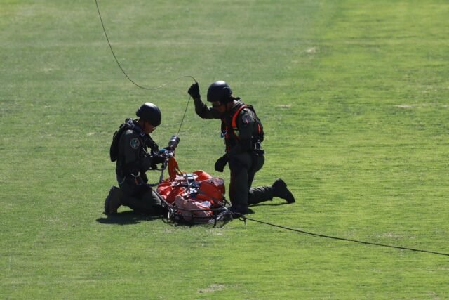 Helicópteros del ejército norteamericano trasladaron en camillas aéreas a algunos de los lesionados y los pusieron sobre el pasto de estadio universitario para que recibieran atención médica.