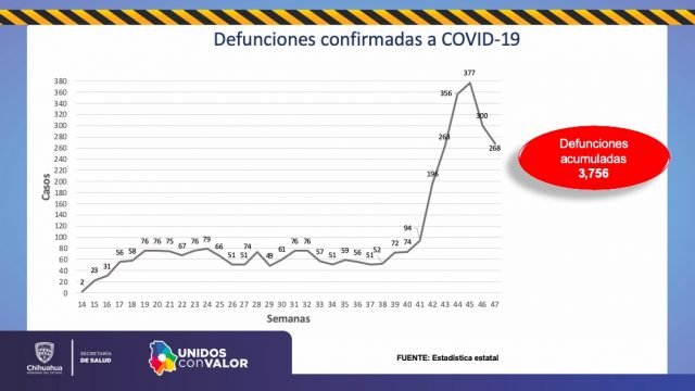 Al momento suman 3 mil 756 personas fallecidas a causa de la pandemia, 48 más en comparación con el último informe. Treinta de los decesos se registraron en Ciudad Juárez, 9 en la capital del estado, 4 en Cuauhtémoc y 1 en cada uno de los municipios de Parral, Guerrero, Madera, Valle de Zaragoza y El Tule.