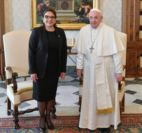El vicecanciller hondureño, Gerardo Torres Zelaya, anunció el encuentro con una foto de ambas personalidades y la leyenda: “La Presidenta Xiomara Castro con el Papá Francisco I en el Vaticano”.