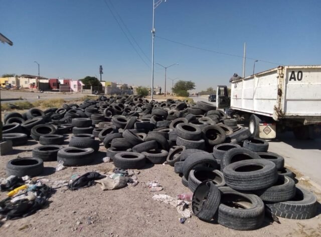 En un operativo de limpieza en la colonia Tierra Nueva, personal de la Dirección de Limpia recogió 620 llantas de un terreno que algunos vecinos del sector han convertido en depósito de basura.