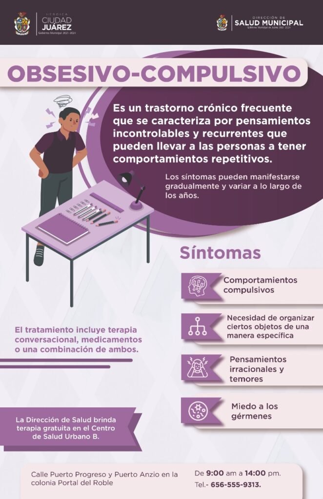 La Dirección de Salud recomienda a la comunidad juarense buscar terapia psicológica para aprender a controlar las emociones y sobrellevar desordenes como el obsesivo-compulsivo, por lo cual el Gobierno Municipal brinda atención gratuita a través del Centro de Salud Urbano B.