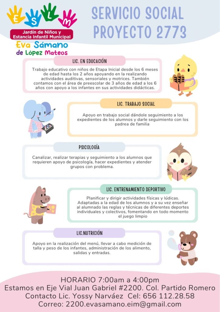 Destacó que los interesados en integrarse, ya sean en prácticas profesionales o servicio social, pueden comunicarse al número telefónico, 656-112-1858 o bien, acudir a la Estancia Infantil ubicada en el Eje Vial Juan Gabriel número 2200 en la colonia Partido Romero para solicitar mayores informes.