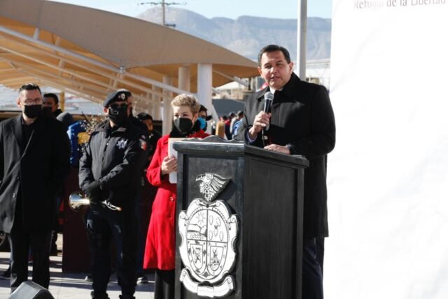 El Presidente Municipal, Cruz Pérez Cuéllar, refrendó esta mañana su compromiso con los juarenses durante la ceremonia de izamiento de la Bandera Nacional que organiza la Dirección de Educación.
