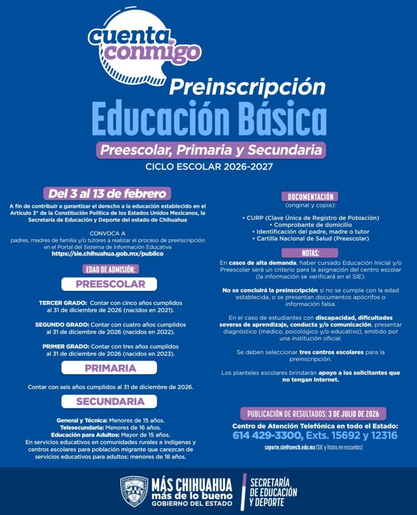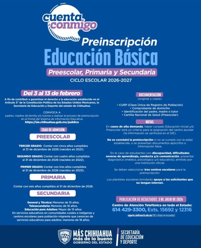 El proceso, que comenzó el pasado 3 de febrero y concluye el 13 del mismo mes, se realiza de manera sencilla a través de la plataforma del Sistema de Información Educativa (SIE): sie.chihuahua.gob.mx/publico/, donde se deben seleccionar tres opciones de plantel.