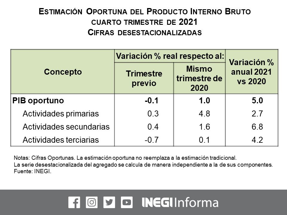 En el cuarto trimestre de 2021, el Producto Interno Bruto (PIB) disminuyó 0.1% en términos reales en relación al trimestre anterior.