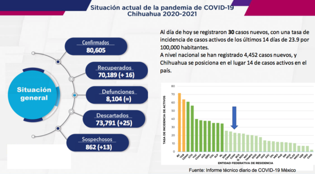 El Gobierno del Estado, a través de la Secretaría de Salud de Chihuahua, presenta este 25 de octubre el reporte COVID-19, en el cual se registran 80 mil 605 (+30) personas confirmadas en la entidad por este padecimiento, 70 mil 189 (+16) casos recuperados, 73 mil 791 (+25) descartados y 862 (+13) casos sospechosos.