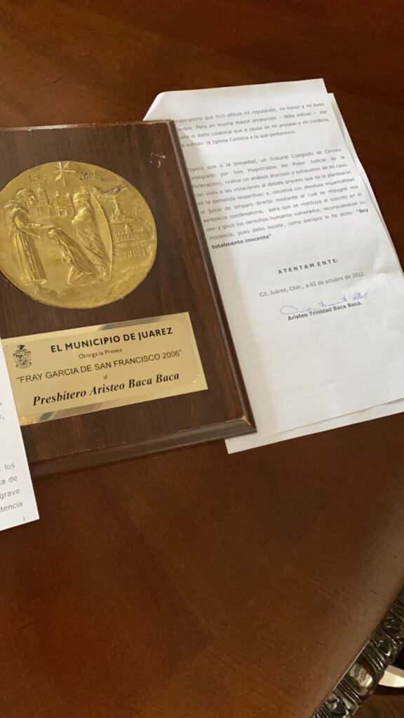 Después de la controversia generada en el Cabildo de Juárez, donde los regidores aprobaron el retiro de la Presea Fray García de San Francisco a Aristeo Baca Baca, este martes el sacerdote regresó el reconocimiento.