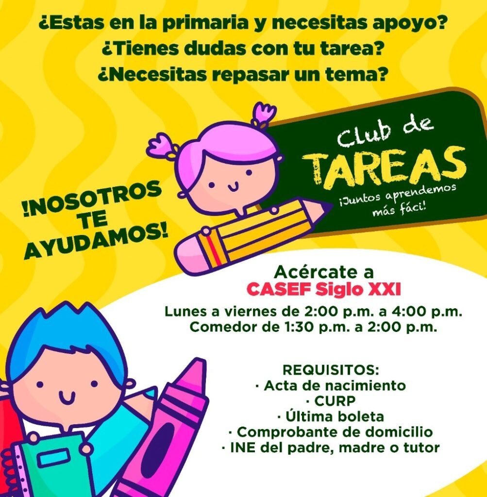 Tras dos años de permanecer inactivo el Programa ‘’Club de Tareas’’ en el Centro de Atención Social y Educativo para las Familias Siglo XXI y por instrucciones de la presidenta del Sistema para el Desarrollo Integral de la Familia del Municipio, Rubí Enríquez, la institución abre nuevamente las puertas a estudiantes de primaria que tengan dudas en sus materias.
