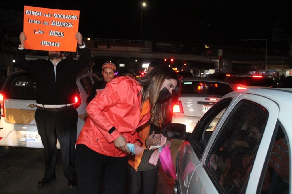 Ayer por la tarde el puente Rotario se vistió de naranja con la presencia de un amplio grupo de jóvenes activistas, además de la participación de las cantantes Martha Urquidi y Mónica Guerra, quienes amenizaron la entrega de volantes a transeúntes, así como a conductores de los vehículos que transitan por el concurrido crucero.