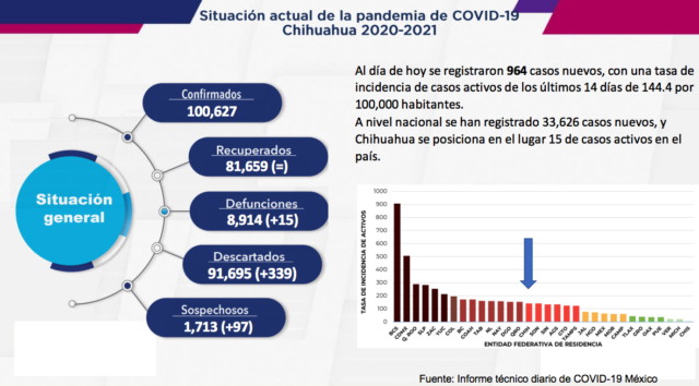 De tal forma, se reporta una tasa de incidencia de casos activos de los últimos 14 días de 144.4 por 100 mil habitantes y a nivel nacional se han registrado 33 mil 626 casos nuevos, de forma que Chihuahua se posiciona en el lugar 15 de casos activos en el país.