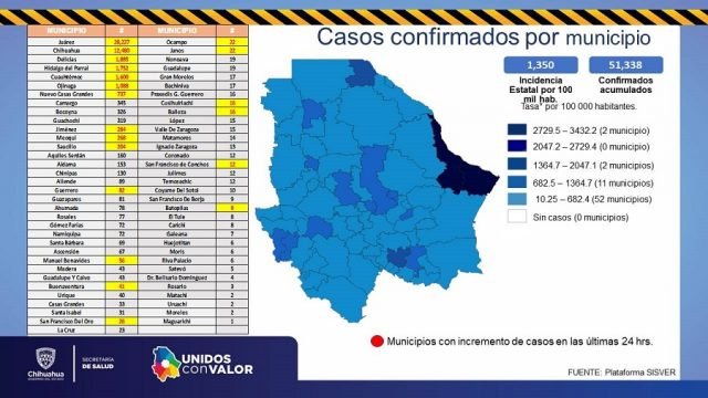 Contagios por municipio: Ahumada 78, Aldama 153, Allende 89, Ascensión 67, Aquiles Serdán 160, Bachíniva 17, Batopilas 9, Bocoyna 326, Balleza 16, Buenaventura 41, Camargo 345, Carichí 8, Casas Grandes 33, Chihuahua 12,480, Chínipas 130, Coronado 12, Coyame Del Sotol 10, Cuauhtémoc 1,600, Cusihuiriachí 16, Delicias 1,885, Dr. Belisario Domínguez 4, Galeana 7, Gómez Farías 72, Guachochi 319, Gran Morelos 17, Guadalupe 19, Guadalupe Y Calvo 43, Guazapares 81y Guerrero 82.