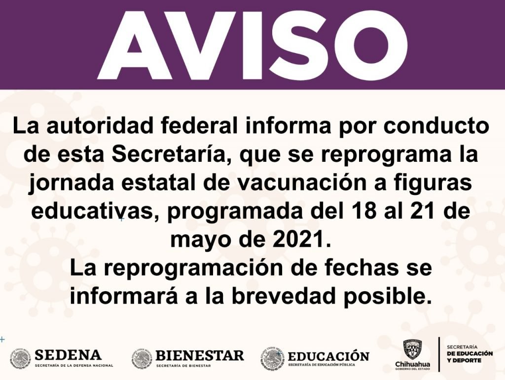 La Secretaría de Educación y Deporte ha sido informada de la reprogramación de la jornada de vacunación al personal de todo el sector educativo del estado de Chihuahua.