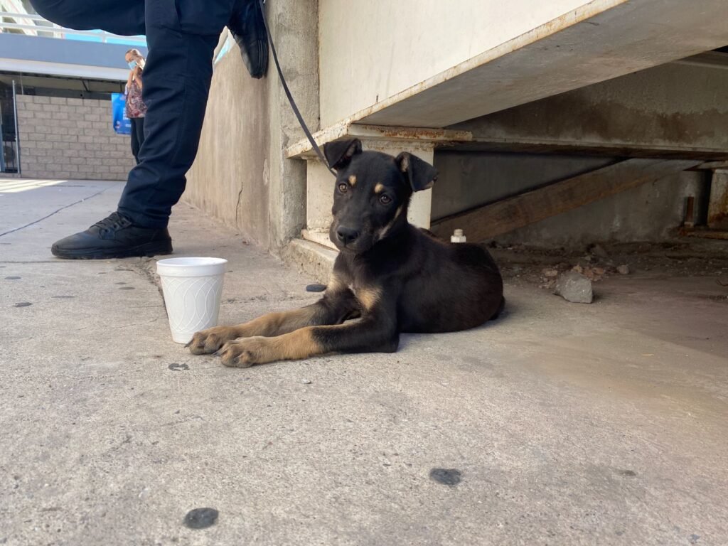 Elementos de la Secretaria de Seguridad Pública Municipal encargados de la seguridad de la unidad administrativa Benito Juárez, resguardaron un cachorro canino que llegó a estas instalaciones y posteriormente lo entregaron a personal de Rescate y Adopción de Mascotas del Municipio (RAMM).