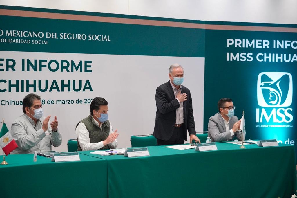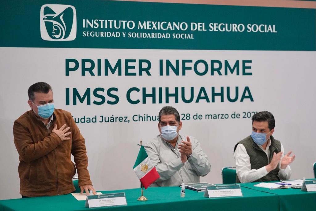 Para la presentación de su primer informe, le acompañaron el director general del IMSS, Zoé Robledo, y el secretario de Salud estatal, Eduardo Fernández Herrera, quien acudió en representación del gobernador Javier Corral Jurado.