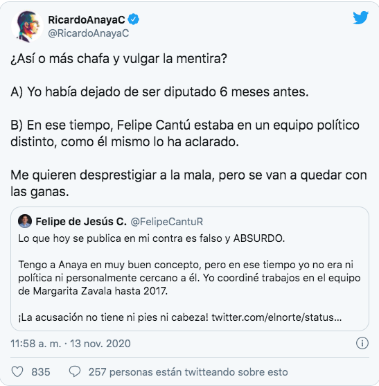 A través de Twitter, Anaya calificó como una vulgar mentira la acusación contra el excandidato a gobernador de Nuevo León.
