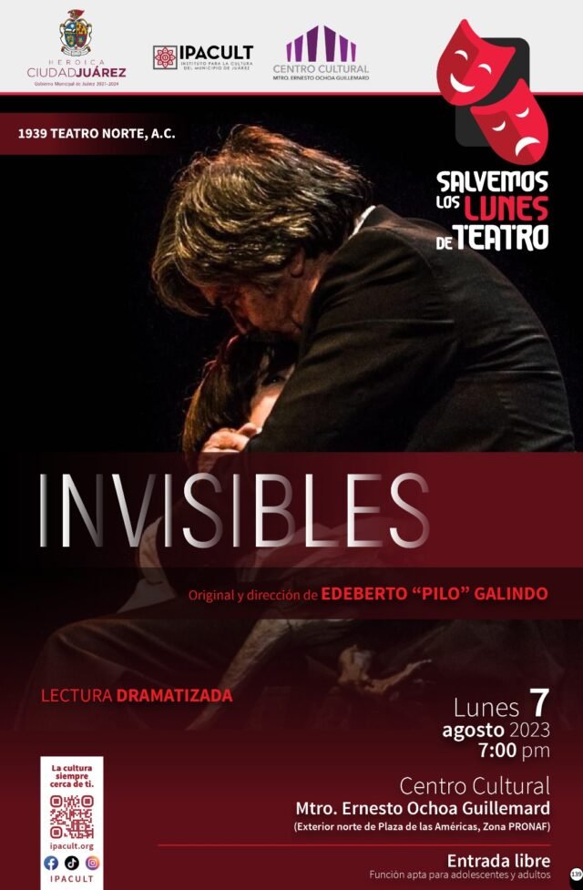 Dijo que el próximo lunes 07 de agosto, a las 7:00 de la tarde, sube al escenario del Centro Cultural “Ernesto Ochoa Guillemard”, la obra Invisibles, texto original de Edeberto “Pilo“ Galindo y bajo su dirección.