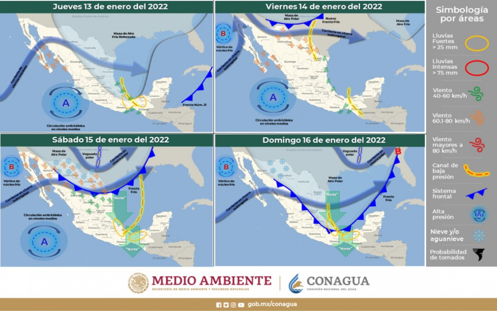 Asimismo, para la noche del viernes se espera el ingreso del frente frío número 22, el cual favorecerá la presencia de lluvias en las regiones noroeste, occidente, suroeste, centro, centro y este del estado, así como posible caída de aguanieve y/o nieve en municipios de la región serrana.