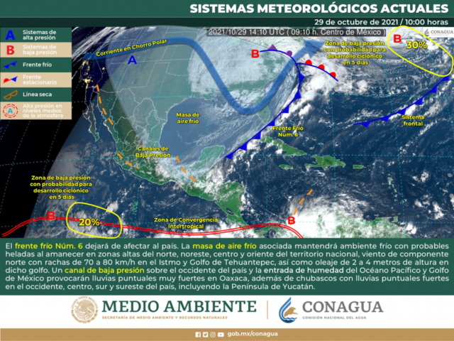 La CEPC informa que para mañana sábado 30 de noviembre, la masa de aire frío asociada al Frente Frío No. 6, en interacción con la corriente en chorro y un canal de baja presión, favorecerá ambiente de frío a fresco por la mañana y de cálido a poco caluroso por la tarde, así como temperaturas muy frías, con heladas por la mañana en la zona serrana.