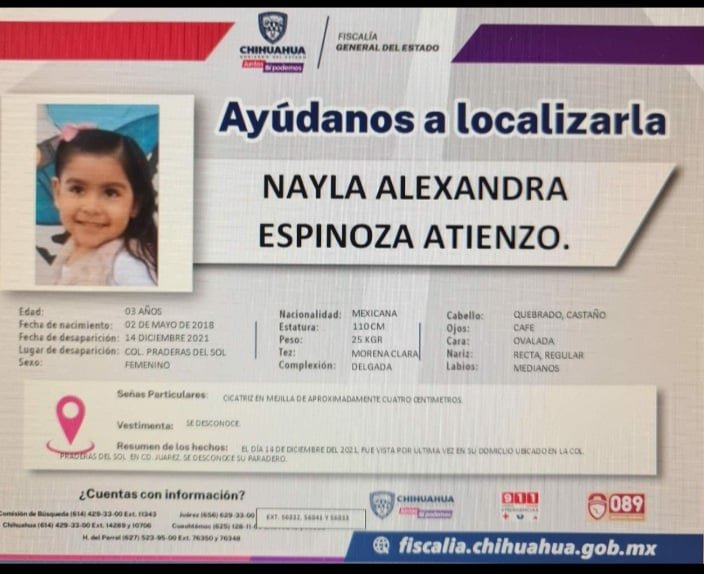 La joven de 22 años fue vista por última vez la tarde del martes en su domicilio ubicado en la colonia Praderas del Sol. Donde se encontraba al cuidado de sus dos menores hijos Liam Alexander Balderrama Espinosa y Nayla Alexandra Espinoza Atienzo.