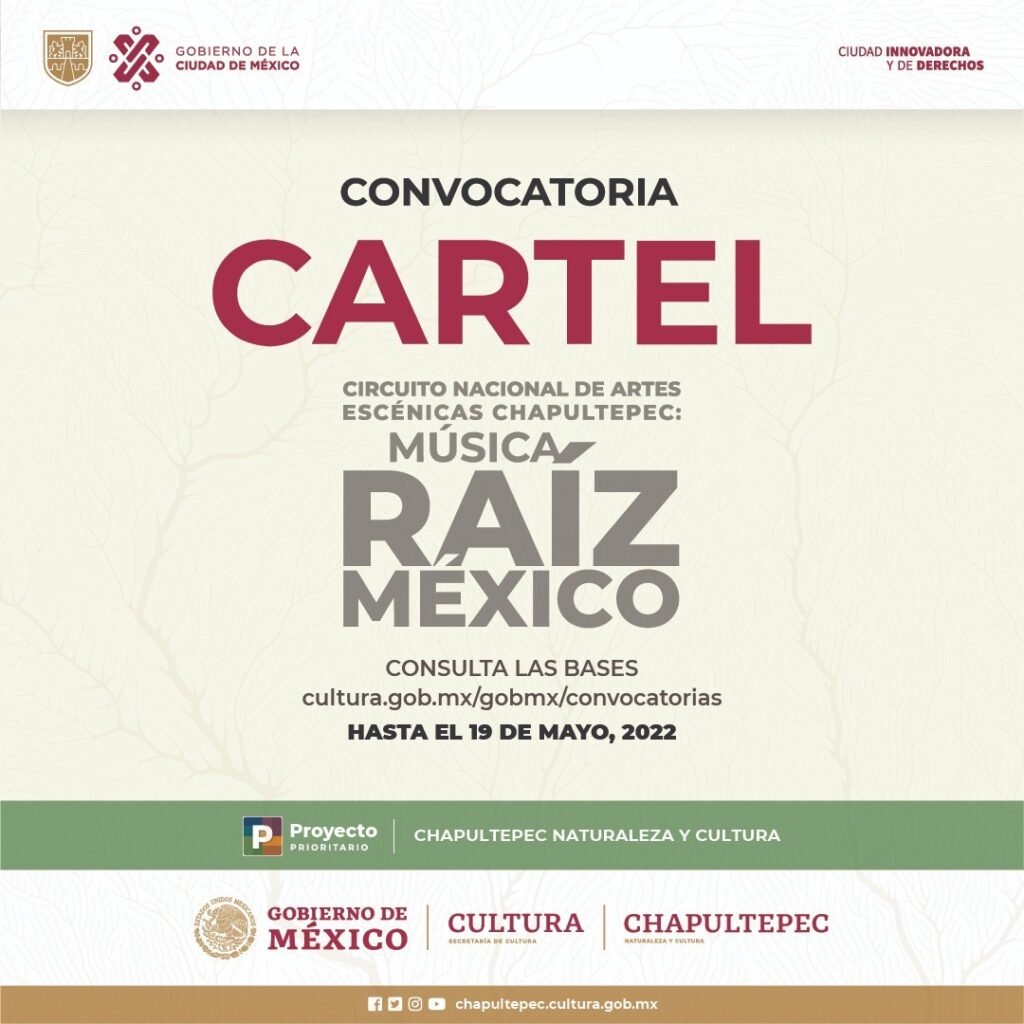 La Secretaría de Cultura del Gobierno de México, a través del proyecto prioritario Chapultepec, Naturaleza y Cultura, la Dirección del Festival Internacional Cervantino y Circuitos Culturales, en coordinación con la Secretaría de Cultura de la Ciudad de México, y Secretarías de Cultura de las entidades de la República Mexicana, publica las convocatorias del Circuito Nacional de Artes Escénicas Chapultepec: Música Raíz México.