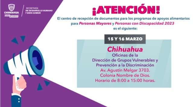 La Secretaría de Desarrollo Humano y Bien Común, a través de su titular Carla Rivas, informó que, conforme a la convocatoria emitida para entregar apoyo alimentario a adultos mayores y personas con discapacidad en el municipio de Chihuahua, la recepción de documentación respectiva será únicamente los días 15 y 16 de marzo.