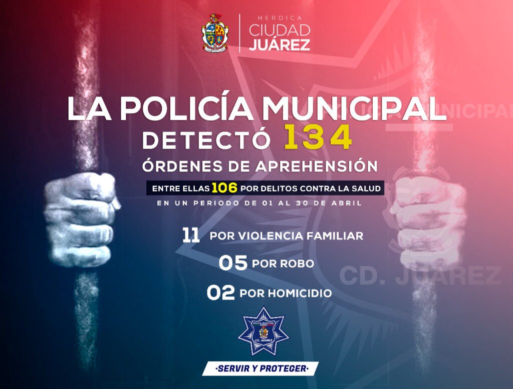 La Secretaría de Seguridad Pública Municipal informa que se detectaron 134 órdenes de aprehensión en un periodo comprendido del 01 al 30 de abril del presente año; entre ellas dos por homicidio.