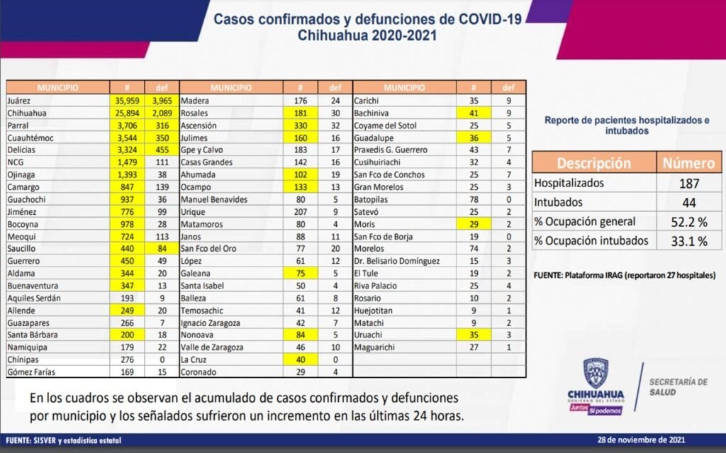 A su vez, los 272 nuevos contagios se presentaron en los municipios de Chihuahua (120), Juárez (53), Saucillo (16), Delicias (10), Jiménez (9), Parral (9), Aldama (5), Buenaventura (5), Guachochi (5), Santa Bárbara (5), Cuauhtémoc (4), Camargo (3), Guerrero (3), Nuevo Casas Grandes (3), Ascensión (2), Julimes (2), Meoqui (2), Moris (2)  Ojinaga (2), Uruachi (2), Ahumada (1), Allende (1), Bachíniva (1), Bocoyna (1), Galeana (1),  Guadalupe (1), La Cruz (1), Nonoava (1), Ocampo (1) y, Rosales (1).