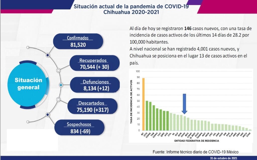 Los nuevos decesos se registraron en Chihuahua (6), Ciudad Juárez (3), Delicias (1), Nonoava (1) y Riva Palacio (1); mientras que los 146 nuevos casos se concentraron en los municipios de Chihuahua (61), Juárez (21), Delicias (14), Bocoyna (10), Guerrero (7), Parral (6), Cuauhtémoc (4), Aldama (3), Allende (3), Nuevo Casas Grandes (3), Julimes (2), Madera (2), Meoqui (2), Balleza (1), Camargo (1), Carichí (1), Guachochi (1), Guadalupe y Calvo (1), Matamoros (1), Saucillo (1) y Urique (1).