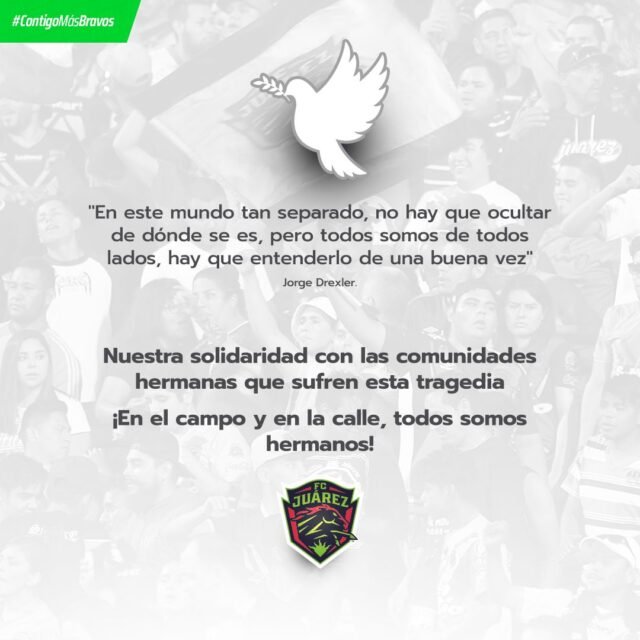 “En este mundo tan separado, no hay que ocultar de dónde se es, pero todos somos de todos lados, hay que entenderlo de una buena vez”. Con este mensaje de Jorge Drexler, el Futbol Club Juárez expresó su solidaridad por la tragedia ocurrida la noche del lunes en el INM.