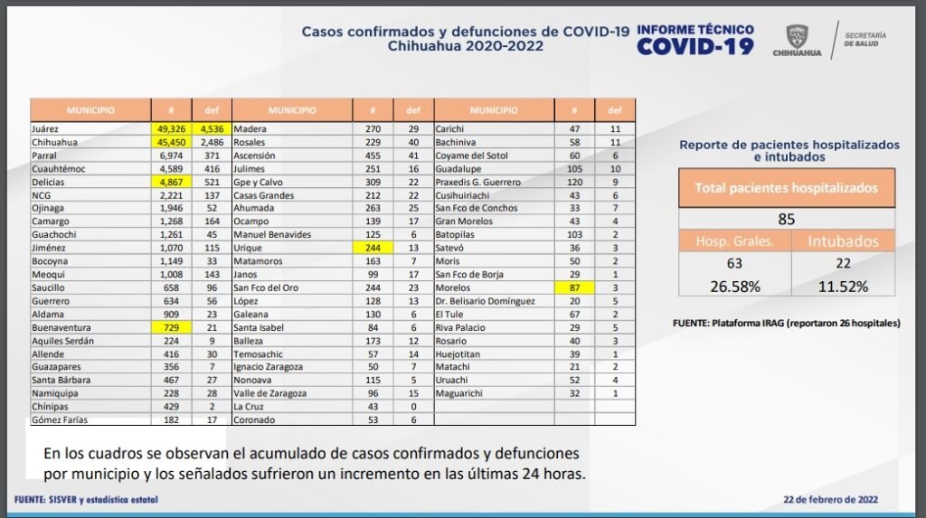 El Gobierno del Estado, a través de la Secretaría de Salud de Chihuahua, presenta este 22 de febrero el reporte COVID-19, en el cual se registran 131 mil 407 (+11) casos confirmados en la entidad, 112 mil 896 (+5) recuperados, 99 mil 528 (+16) descartados y mil 899 (-19) casos sospechosos.