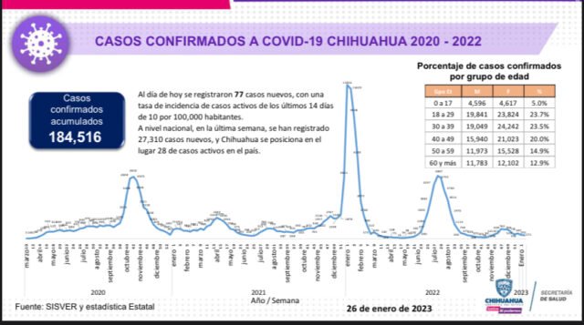 El Gobierno del Estado, a través de la Secretaría de Salud de Chihuahua, presenta este 26 de enero el reporte COVID-19, que registra un acumulado de 184 mil 516 (+77) casos confirmados, 271 casos por inicio de síntomas y 12 pacientes hospitalizados.