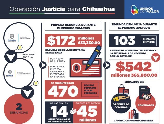En el marco de la Operación Justicia para Chihuahua, se detectó que en los ejercicios fiscales del 2012 al 2015 de la administración estatal, se emitieron 103 cheques a favor del Gobierno del Estado y/o Secretaría de Hacienda, por un total de 542 millones 365 mil 800 pesos, informó la secretaria de la Función Pública, Mónica Vargas Ruiz.