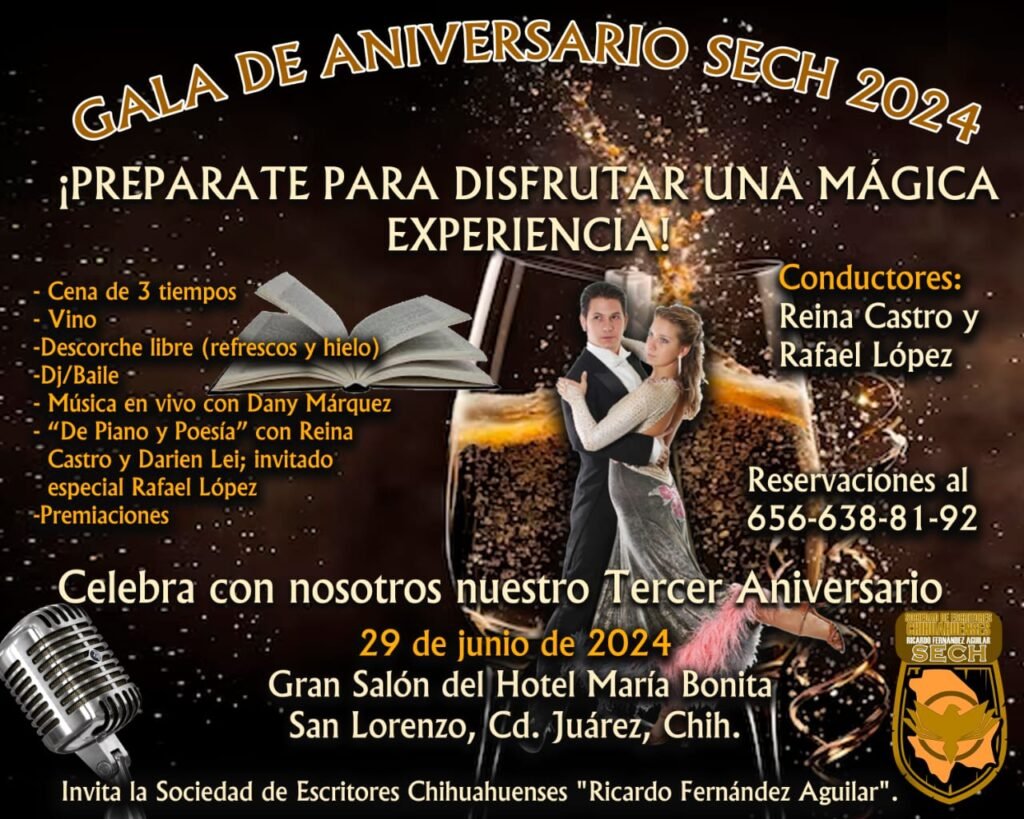 Con motivo de la celebración de su tercer aniversario, la Sociedad de Escritores Chihuahuenses “Ricardo Fernández Aguilar” invita a la cena de gala que se llevará a cabo el próximo 29 de junio en el Gran Salón del Hotel María Bonita, San Lorenzo, en Ciudad Juárez.