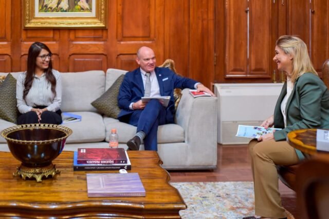 La gobernadora del Estado, Maru Campos, en compañía de los representantes de UNODC y del secretario de la Coordinación de Gabinete, Luis Serrato Castell, sostuvieron un diálogo en el que se acordó dar seguimiento a los proyectos de consolidación del Sistema de Justicia Penal en México con la integración de las capacidades tanto de seguridad como de justicia para la erradicación de la impunidad.