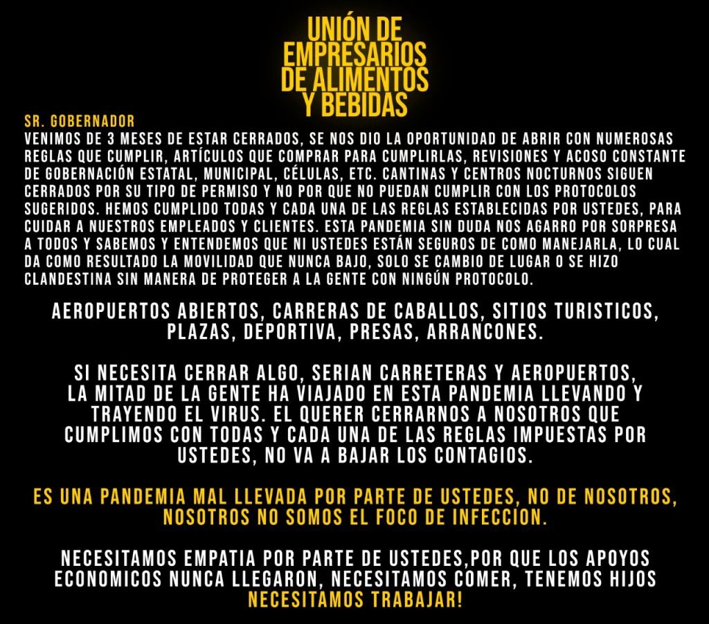 En el texto publicado, los empresarios le recuerdan al mandatario estatal que nunca recibieron los apoyos prometidos para este sector de la economía y que ellos, al igual que todos los chihuahuenses, también tienen hijos y necesitan trabajar para poder comer.