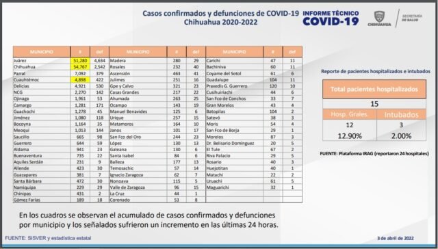 El Gobierno del Estado, a través de la Secretaría de Salud de Chihuahua, presenta este 3 de abril el reporte COVID-19, en el cual se registra un acumulado de 143 mil 490 (+170) casos confirmados, 128 mil 328 (+99) casos recuperados, 103 mil 629 (+118) descartados y mil 698 (+4) casos sospechosos.