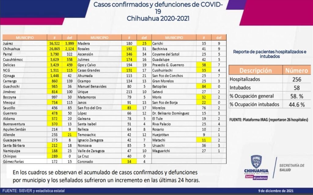 Resaltó que mientras en la mayor parte del país las curvas epidemiológicas van en descenso, en Chihuahua se registra un aumento sostenido y actualmente la ocupación hospitalaria está en un 58% y los enfermos graves también se han incrementado. A este jueves, en el estado hay 256 personas hospitalizadas en 26 hospitales públicos, de los cuales 58 están intubados.