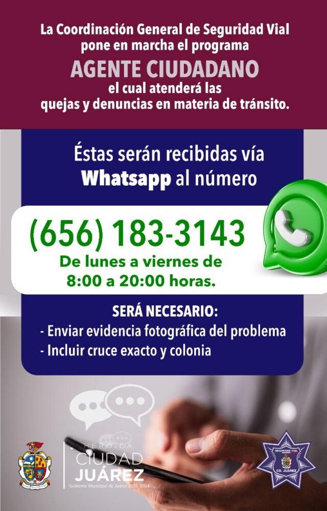 Se le recuerda a la ciudadanía que es indispensable enviar evidencia fotográfica del hecho, incluyendo cruce exacto y colonia, al presentar su denuncia al número telefónico de Whatsapp 656-183-3143 con el objetivo de darle seguimiento a la inconformidad.
