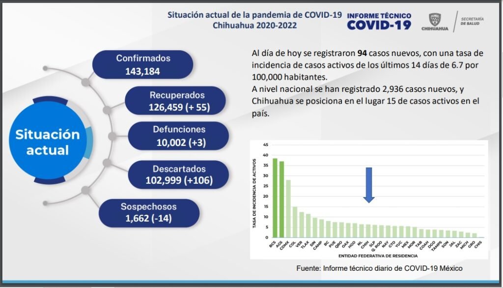 En el país se registraron 2 mil 936 casos nuevos y el estado de Chihuahua se posiciona en el lugar 15 de casos activos a nivel nacional, de forma que presenta una tasa de incidencia de los últimos 14 días, de 6.7 casos activos por cada 100 mil habitantes.