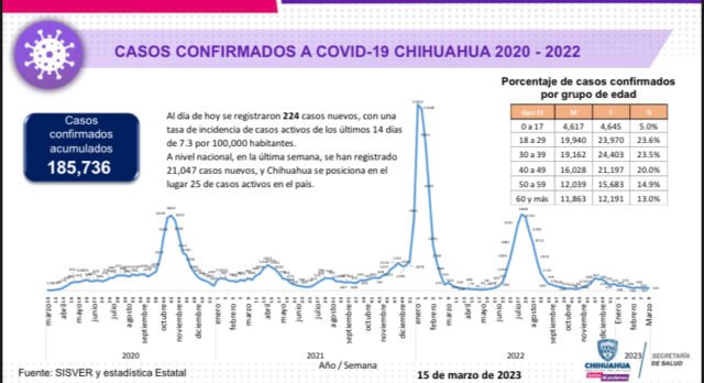El Gobierno del Estado, a través de la Secretaría de Salud de Chihuahua, presenta este 15 de marzo el reporte COVID-19, que registra un acumulado de 185 mil 736 (+224) casos confirmados, 155 por inicio de síntomas y 13 pacientes hospitalizados.