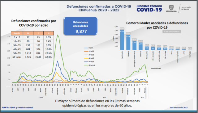 La cantidad de personas que han perdido la vida por COVID-19 ascendió a 9 mil 877 con 14 fallecimientos que corresponden a los municipios de Juárez (+4), Chihuahua (+3), Parral (+1), Cuauhtémoc (+1), Delicias (+3), Jiménez (+1) y Saucillo (+1).