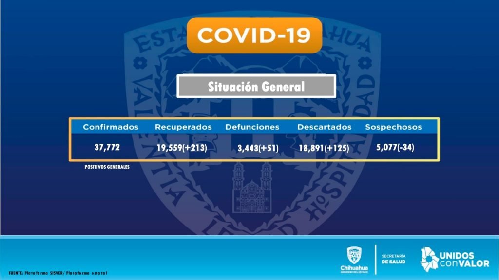 Valenzuela Zorrilla añadió que en el mismo periodo de 24 horas hubo 51 nuevas defunciones, con las que suman ya 3 mil 443 en la entidad, de las cuales 15 se registraron en la capital, 9 en Ciudad Juárez, 7 en Parral, 6 en Camargo, 2 en Jiménez, Guachochi y San Francisco de Conchos y una en Delicias, Cuauhtémoc, Meoqui, Saucillo, Santa Bárbara y Nonoava.