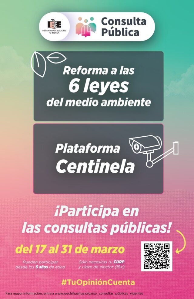 Chihuahua, Chih.— A una semana de que concluyan las consultas públicas “Plataforma Centinela” y “Relativa a la Reforma Ambiental”, el Instituto Estatal Electoral de Chihuahua (IEE) invita a la población chihuahuense a participar en estos ejercicios que se desarrollan en todo en territorio estatal, del 17 al 31 de marzo.