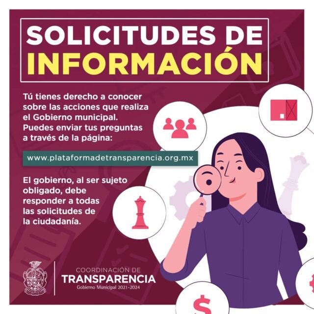 La coordinadora dijo que todos los juarenses tienen derecho a realizar preguntas al Gobierno Municipal, por lo que los interesados en hacerlo, pueden ingresar a la página https://www.plataformadetransparencia.org.mx y elegir el Estado “Chihuahua”, y después el Sujeto obligado “Juárez”.