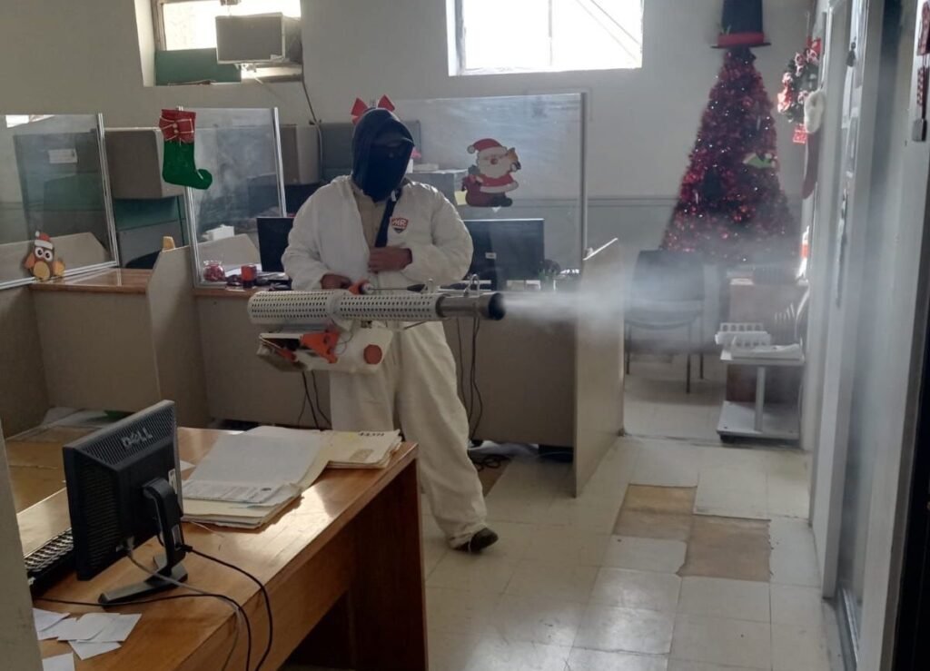 Personal de la Dirección General de Servicios Públicos implementó operativos de desinfección en oficinas municipales con el fin de reducir los efectos negativos de agentes biológicos en el personal y ciudadanos que acuden por estas instalaciones a realizar algún trámite administrativo.