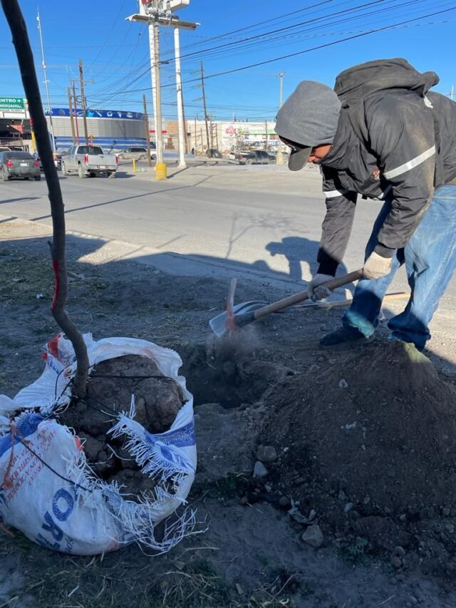 Brigadas de la Dirección de Parques y Jardines continúan trabajando en el programa de forestación en la ciudad, en esta ocasión plantaron huizache, palo verdes y mezquite en el camellón central de la avenida Cesáreo Santos y palmas washingtonias en el sector de la Mega Bandera, en el parque El Chamizal.