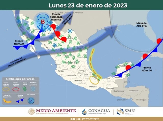 La Coordinación Estatal de Protección Civil (CEPC), indicó que, para este lunes 23 y martes 24 de enero, el ingreso del frente frío número 27 en interacción con la Cuarta Tormenta Invernal, causará un marcado descenso en el valor de las temperaturas en todo estado, además de la posibilidad de presencia de nieve, aguanieve durante este inicio de semana así como intensas rachas de viento.