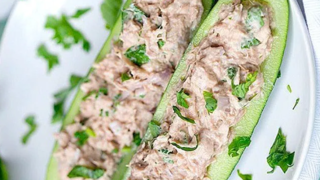 Parte el pepino a la mitad y retira las semillas. En un tazón coloca el queso crema, la sal con ajo, la pimienta y la lata de atún; mezcla todos los ingredientes. Agrega a cada mitad la mezcla. Ahora sí, ¡A disfrutar!