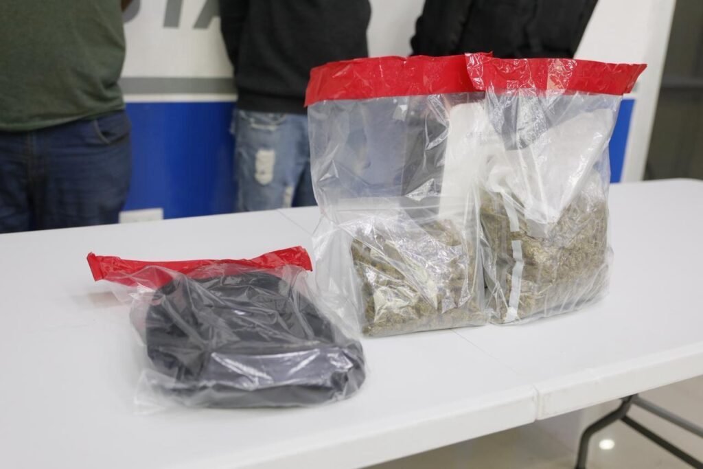 Durante la inspección, a uno de los masculinos se le aseguró una bolsa tipo bandolera que contenía un envoltorio plástico transparente con hierba verde y seca con características de marihuana, con un peso aproximado de 148 gramos. Al inspeccionar el interior del automóvil se localizó un segundo envoltorio con hierba de las mismas características, con un peso cercano a 498 gramos, que también fue asegurado.