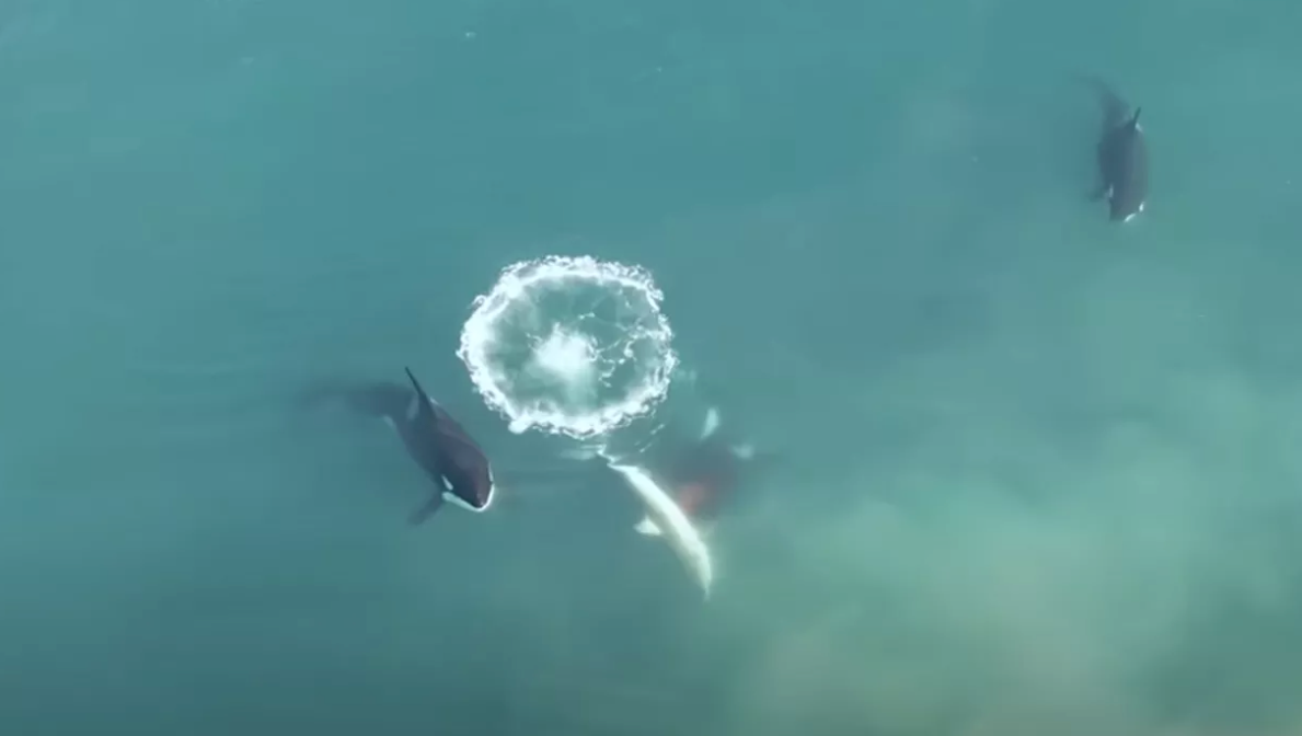 Justo antes de las imágenes del dron, el piloto del helicóptero fue testigo de la muerte de dos tiburones desde el aire. Con su teléfono, el piloto consiguió tomar una serie de imágenes y breves videos de las orcas depredadoras.